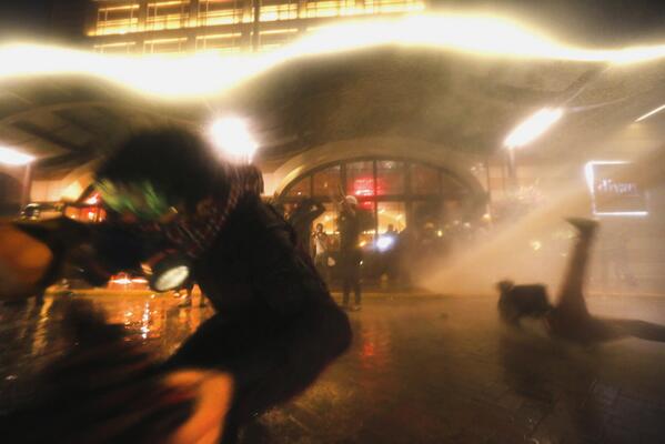 Gli idranti nel frattempo hanno cambiato colore: ora son comparse coloratissime strisce rosse d’acqua a tagliare le cariche e i cortei.